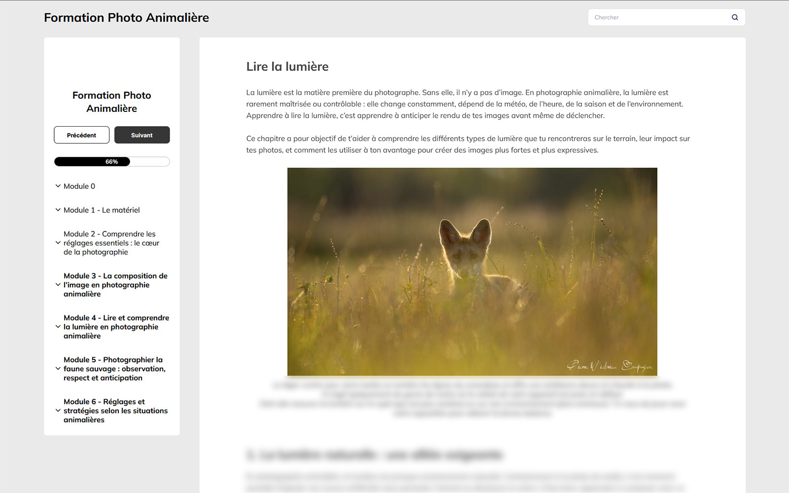La formation se compose de 7 modules regroupant 31 chapitres, couvrant la technique, la lumière, la composition, le terrain et l’éthique. Chaque module se termine par des quiz de validation afin de mettre en pratique les notions abordées, notamment sur le terrain.