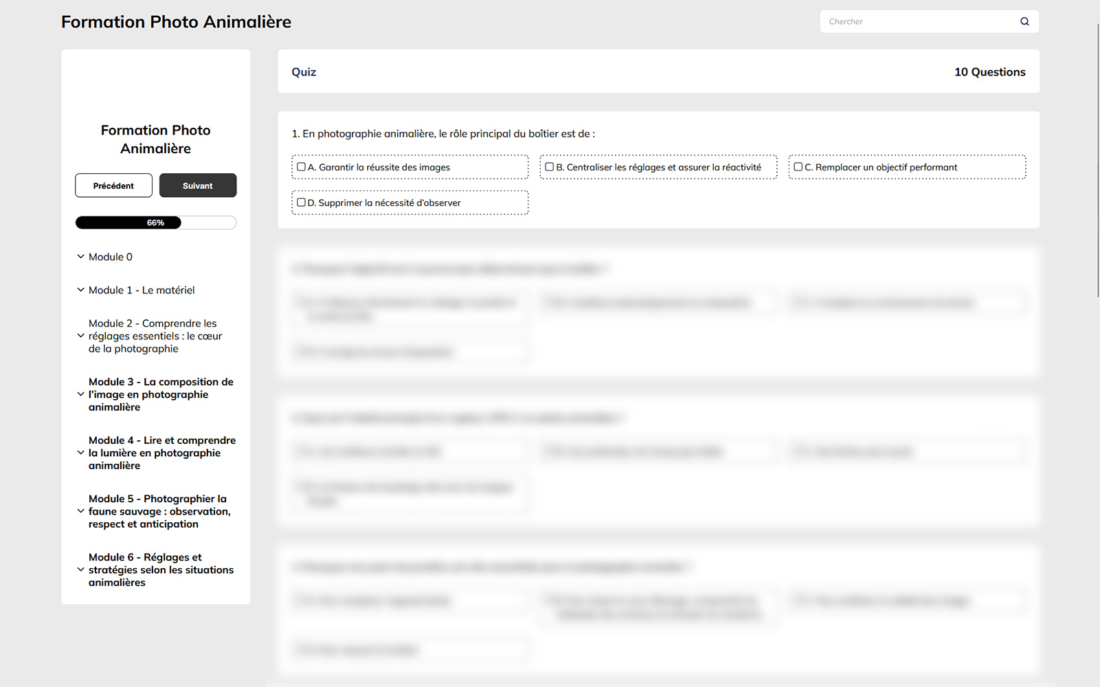 Avec Formation Photo Animalière, vous accédez à un parcours complet, composé de modules détaillés, d’exercices et de quiz pour valider vos acquis, ainsi qu’à un groupe Facebook privé permettant d’échanger, de poser vos questions et de partager vos images. La formation évolue dans le temps : chaque ajout ou enrichissement futur est inclus sans surcoût .